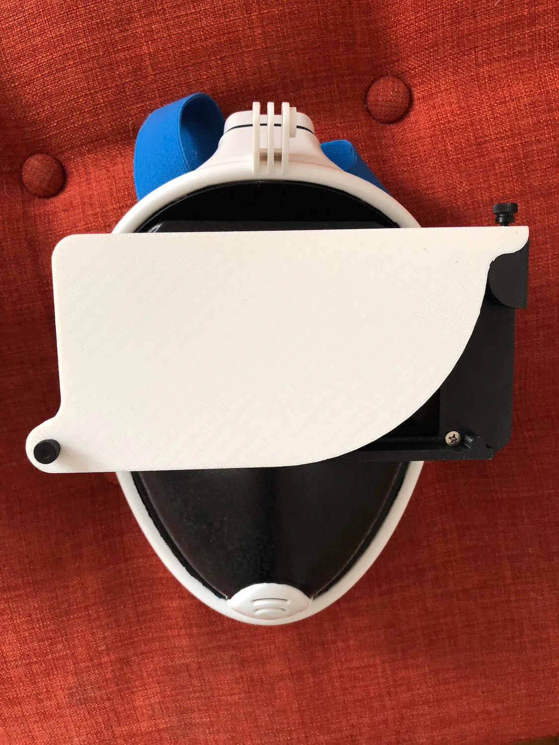 One of the first 3D printed prototypes with a hinged enclosure for a phone glued to a full face snorkel mask, with a very Friday the 13th vibe!